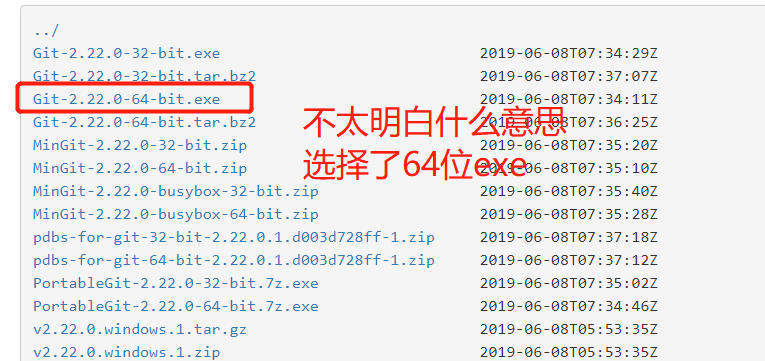3.网速慢,选择了淘宝镜像下载,不太明白 rc、mingit 代表什么含义,点击选择了v2.22.0.windows.1 下面 64 位 exe 文件
