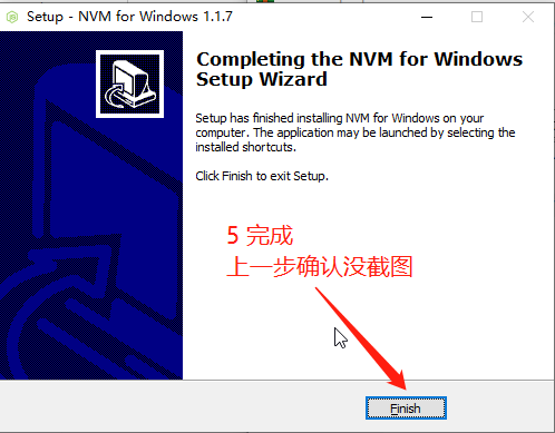 3.第5步点击Finish安装完成,然后cmd输入nvm,显示安装版本 1.1.7